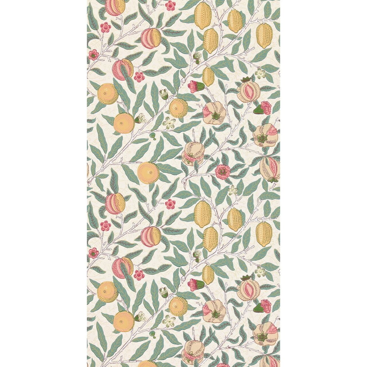モリスの初期の三大壁紙デザインのひとつ。果実や花や葉は様式化されながら、複雑さと流れるリズムがあります。モリスは、極端な写実主義や規則性のどちらにも反対し、いきいきした自然の魅力を描こうとしました。
