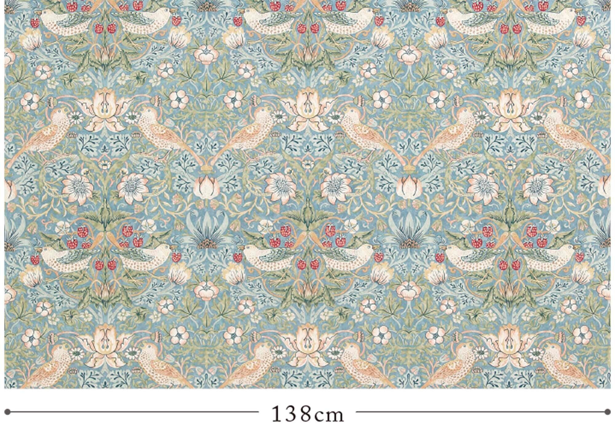 モリスの夏の別荘「ケルムスコット・マナー」の庭で、いちごをついばむ鳥たちを温かな目線で描いたモリスの代表作。合わせ鏡のような左右対称のパターン構成が特徴。オリジナルはマートン・アビー工房において最初に作られた多色使いのインディゴ抜染プリント生地。