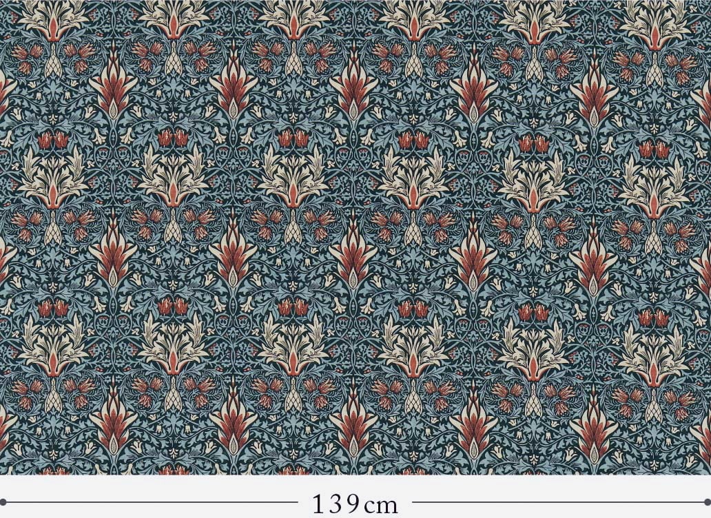 モリスが研究していたインドのテキスタイルの色や模様の影響を受けたパターンのひとつ。「スネークヘッド(蛇の頭)」と呼ばれる釣鐘型のフリティラリアの花がより大きくフォーマルなモチーフを彩っています。